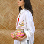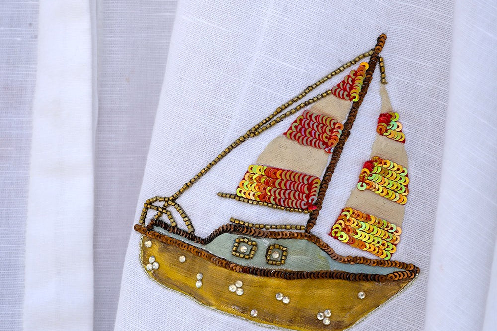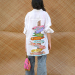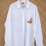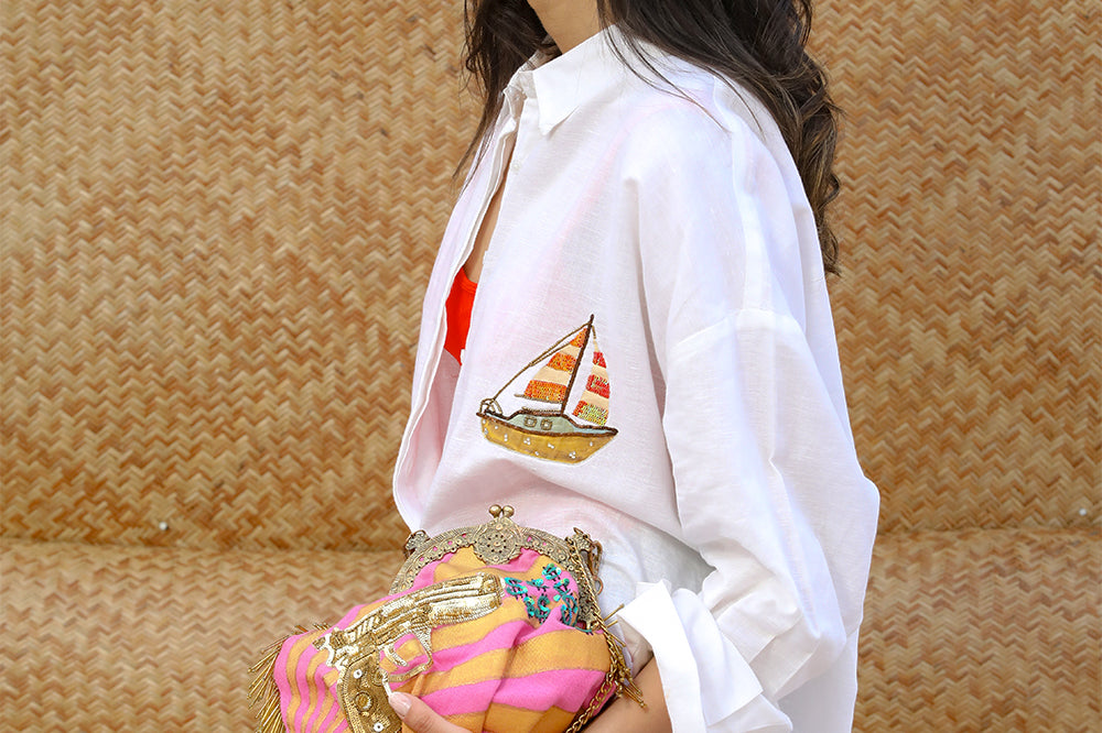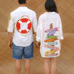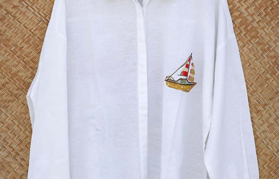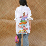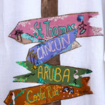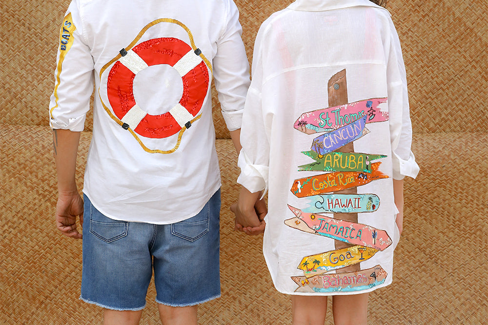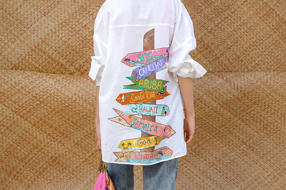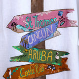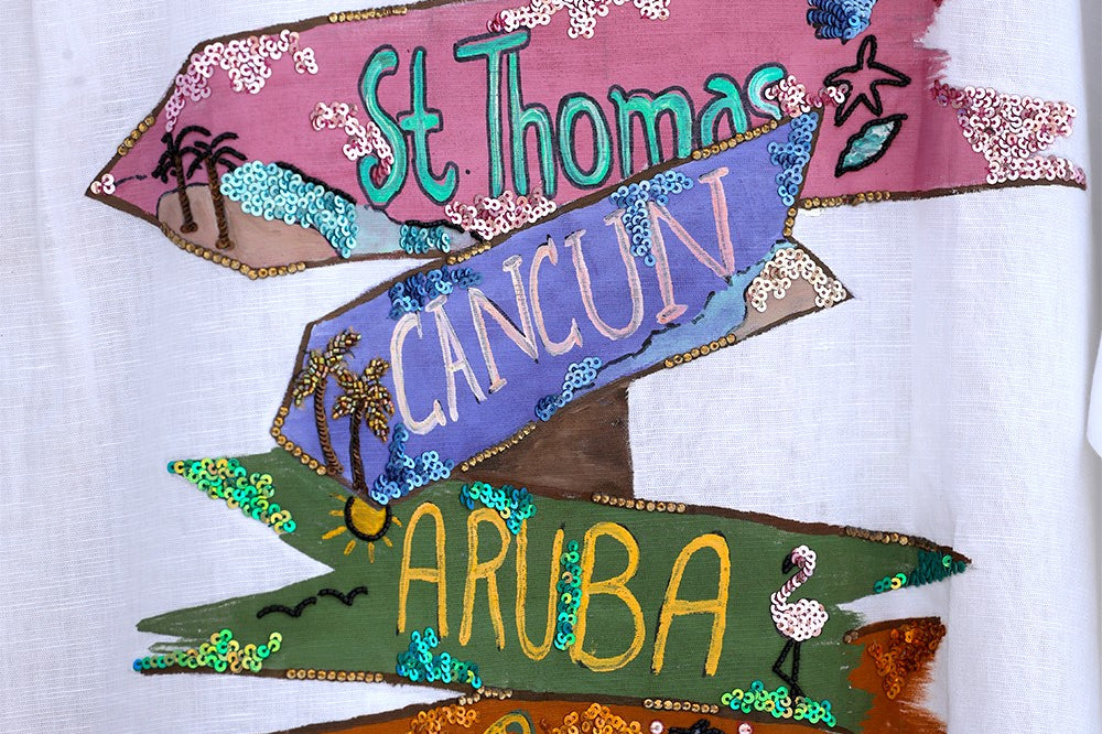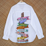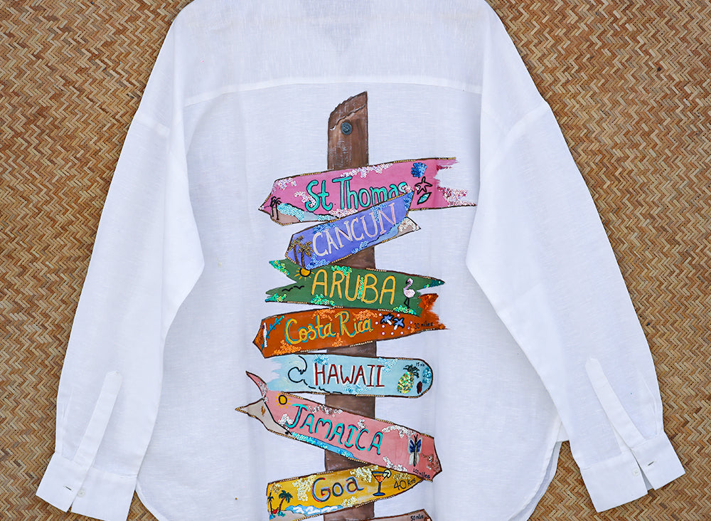This is the hand painted and hand embroidered 'Bucket List' shirt featuring a list of holiday destinations that can only be described as paradise!