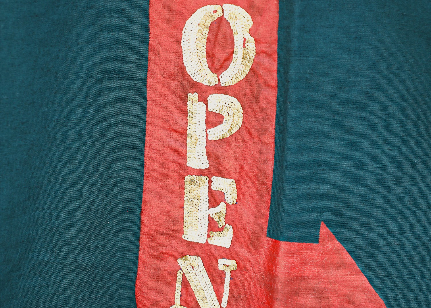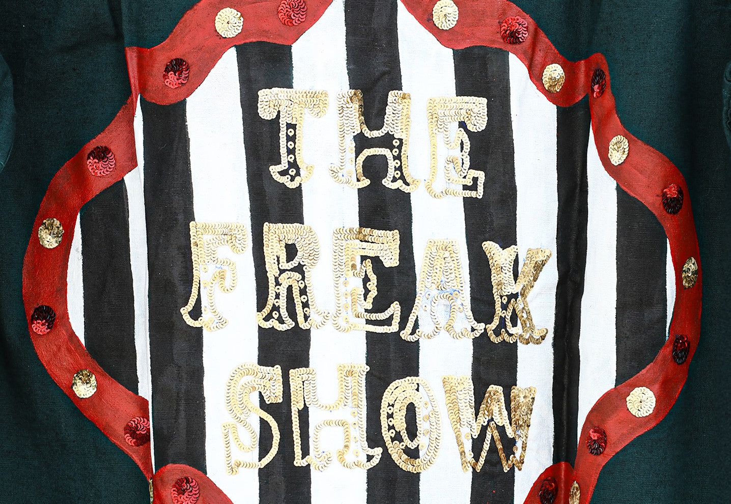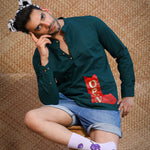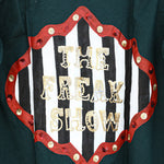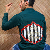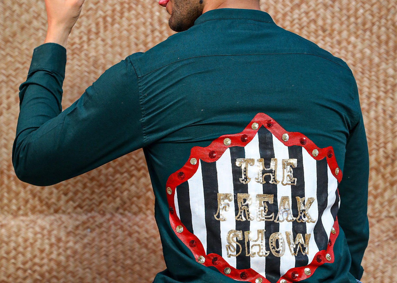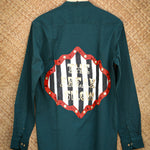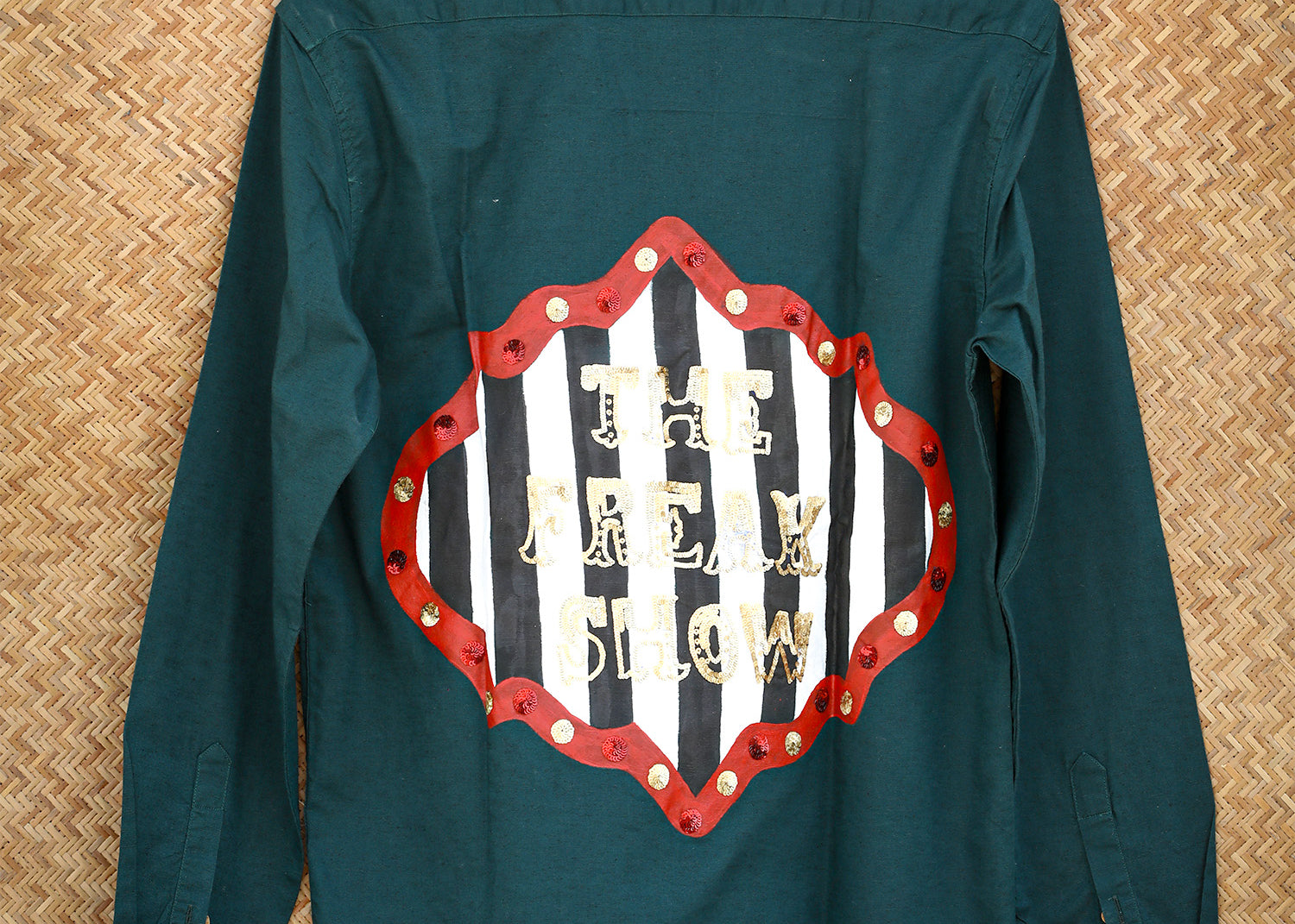 This dark green linen shirt is hand painted and hand embellished with old timey circus motifs to remind you that life is still very much a freak show!