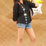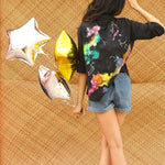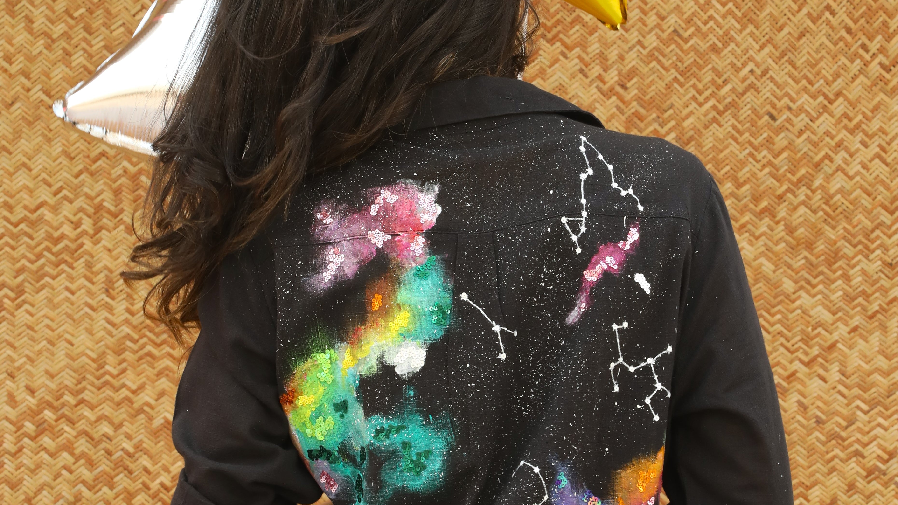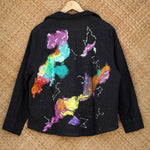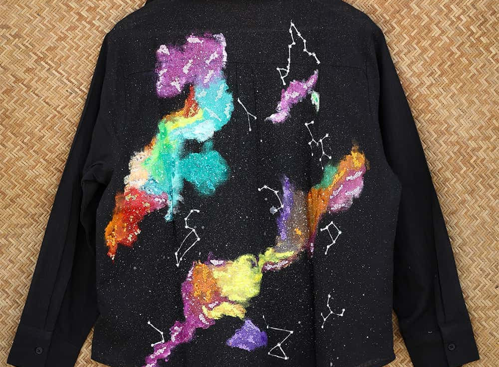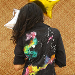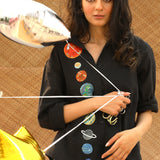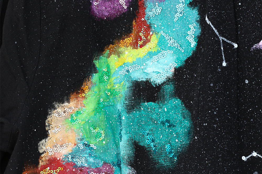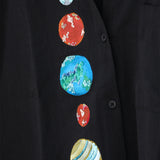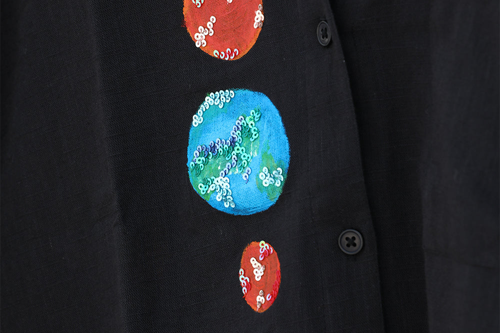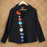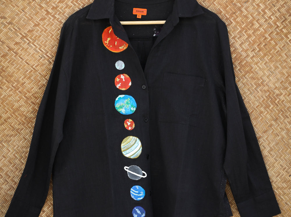 The 'Planetarium' shirt is inspired by those conversations and that wonder we still feel as adults when we think of the mystery that is outer space. Hand painted and hand embroidered planets feature down the front (yes, even Pluto!) and on the back is a cosmic canvas, constellations and stars.