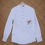 This linen shirt is a kurta style slim fit silhouette. Please refer to the size chart for your nearest best fit.