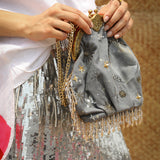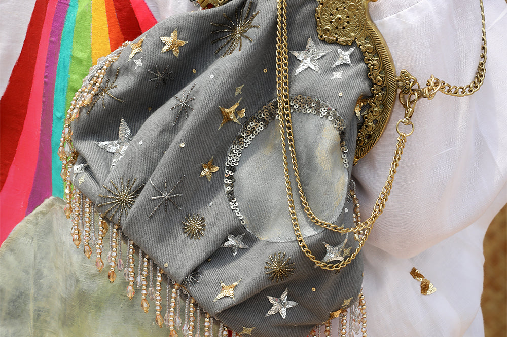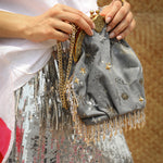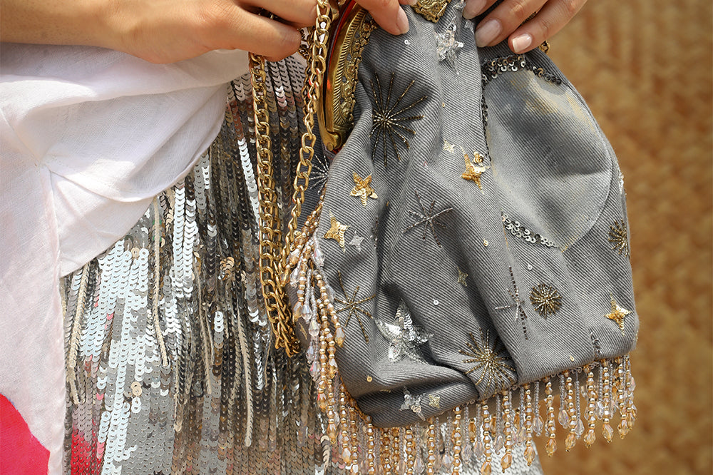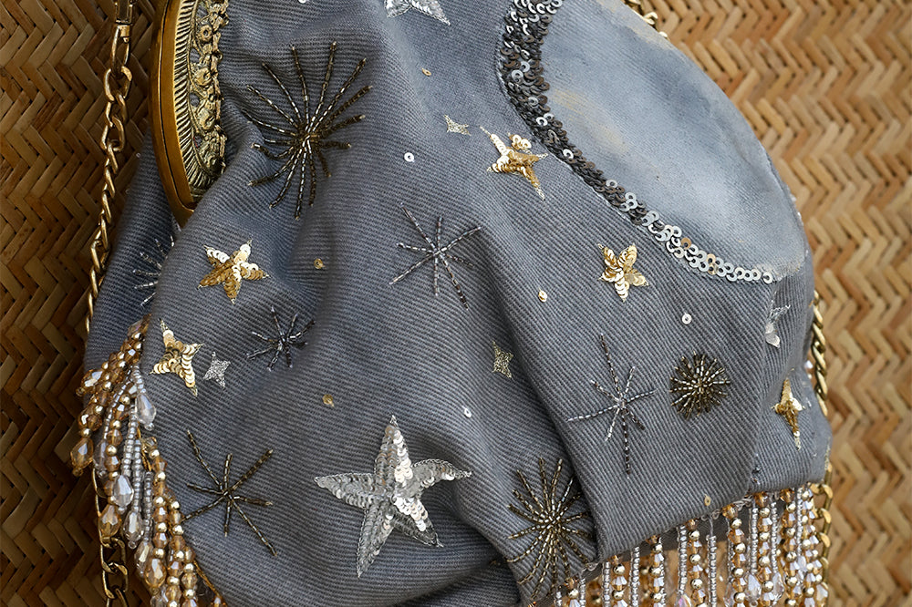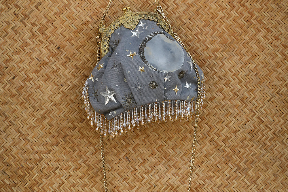 This one is for all those nights you spent on the terrace under the night sky! Style it during the day or night with jeans, dresses, ethnic wear, the sky is the limit! The grey denim batwa clutch bag has a kiss clasp closure and comes with 2 detachable chains; one to use as a cross body bag and a shorter chain to carry as an evening bag. This batwa bag is made from cotton denim that has been dyed. To clean, lightly brush with a damp cloth or dry clean. Keep in the dust bag provided to ensure it lasts for years to come. Please note that due to photography and lighting, there may be a slight variation in colour from the image displayed. Images & colours also appear slightly different on various phone and computer screens so please keep that in mind.