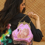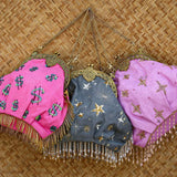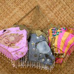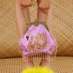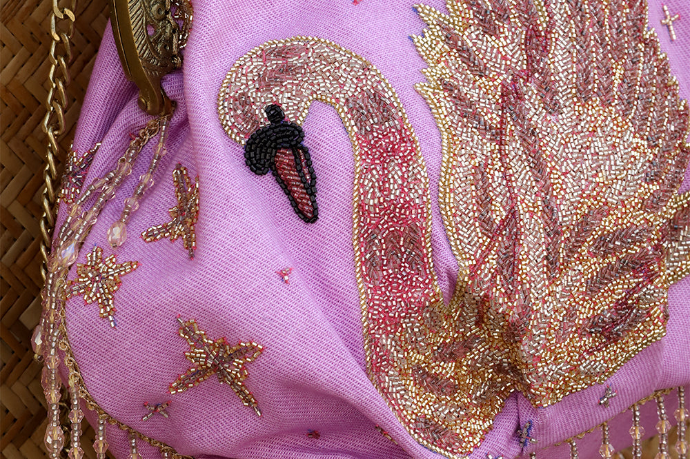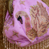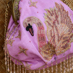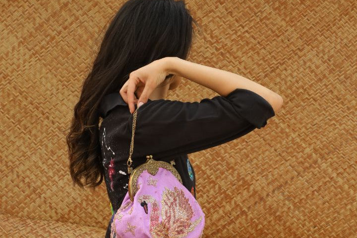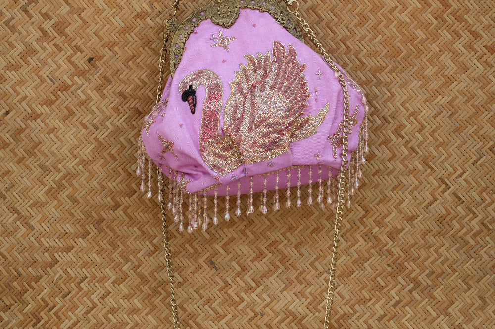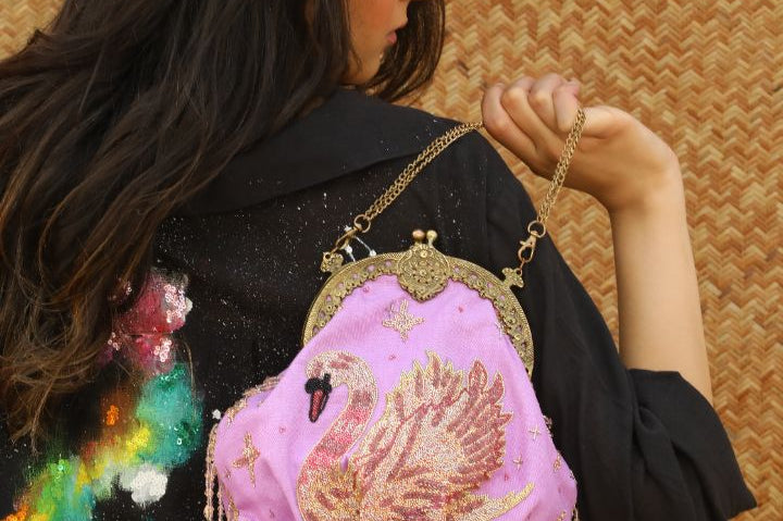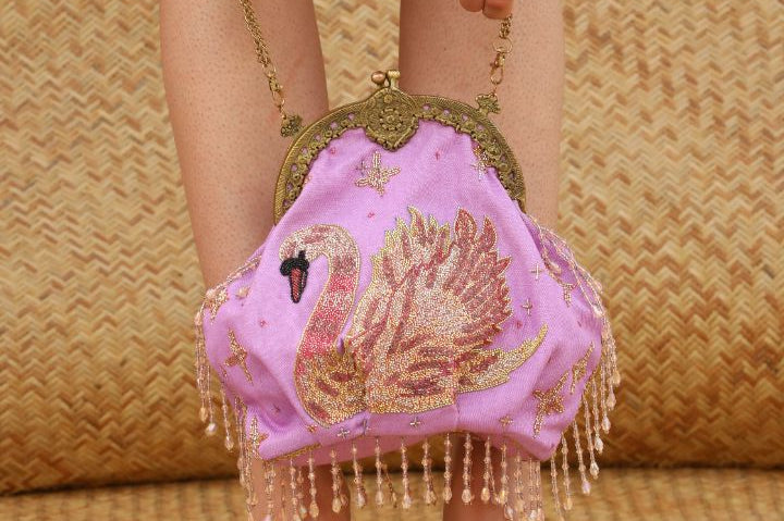 You know when you used to go for family picnics in those massive parks with little lakes and saw those swan shaped boats that your parents never let you get into? Yeah... The lilac denim batwa clutch bag is fully hand embroidered, features a kiss clasp closure and comes with 2 detachable chains; one to use as a cross body bag and a shorter chain to carry as an evening bag. This batwa bag is made from cotton denim that has been dyed. To clean, lightly brush with a damp cloth or dry clean. Keep in the dust bag provided to ensure it lasts for years to come. Please note that due to photography and lighting, there may be a slight variation in colour from the image displayed. Images & colours also appear slightly different on various phone and computer screens so please keep that in mind.