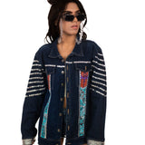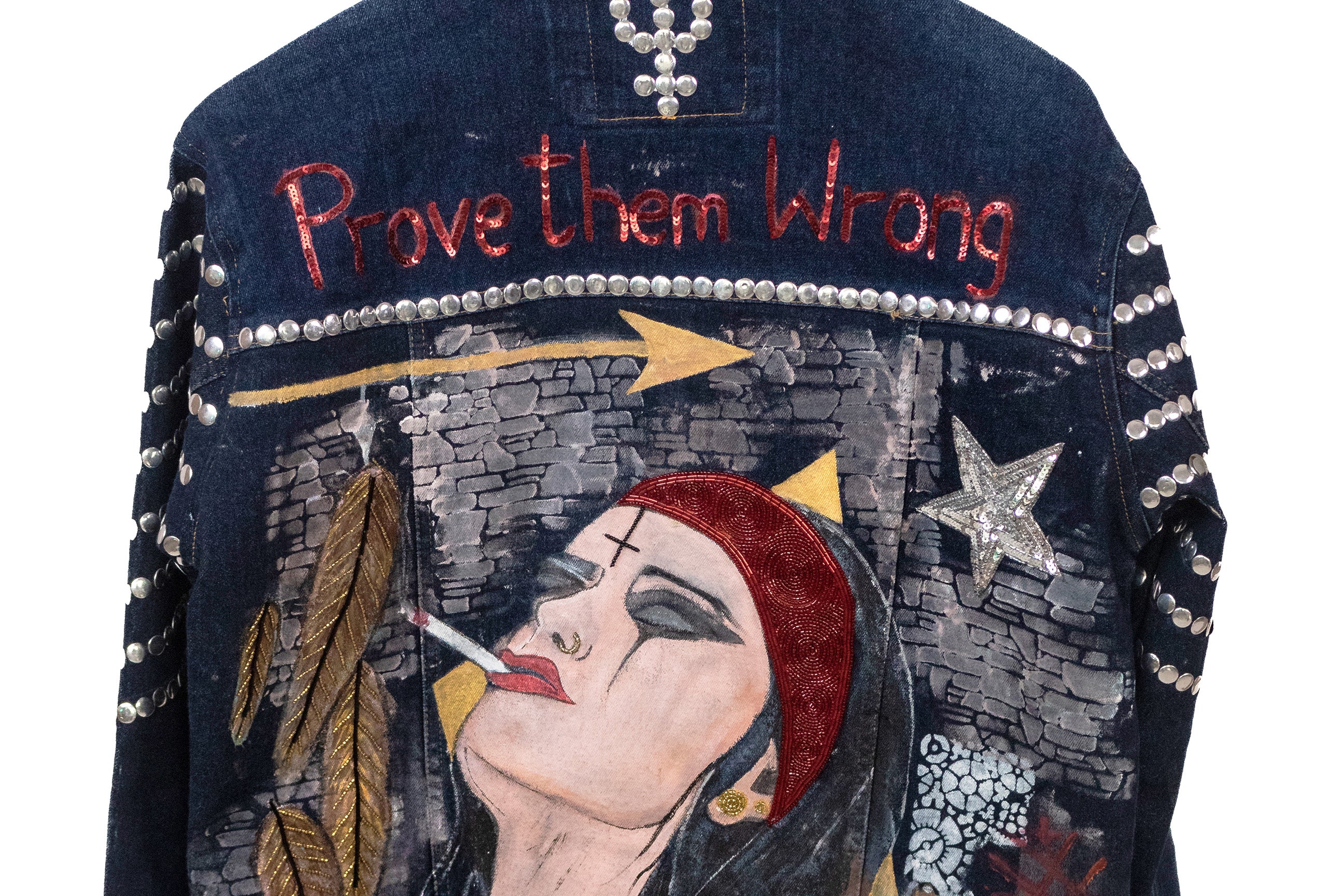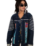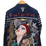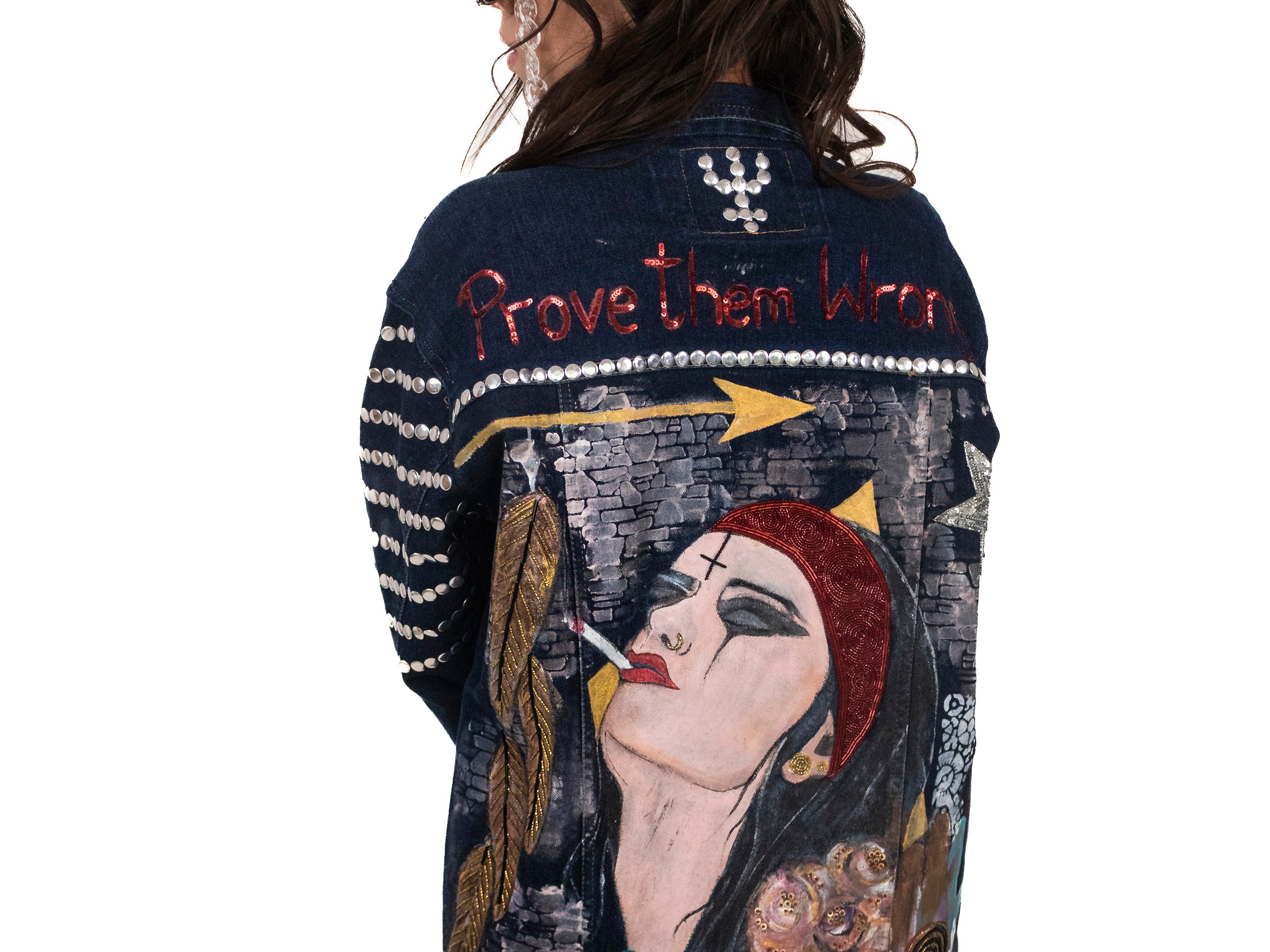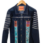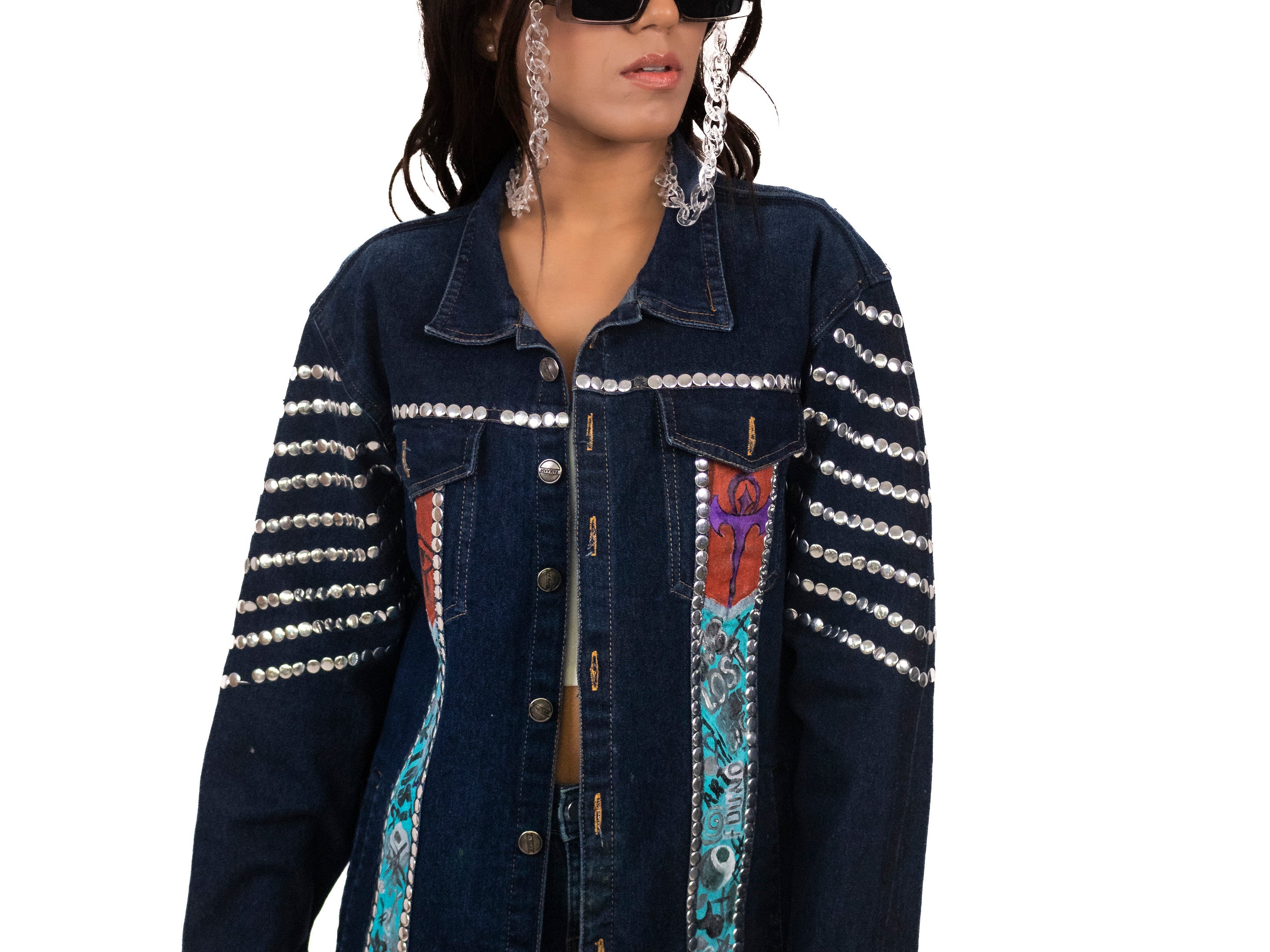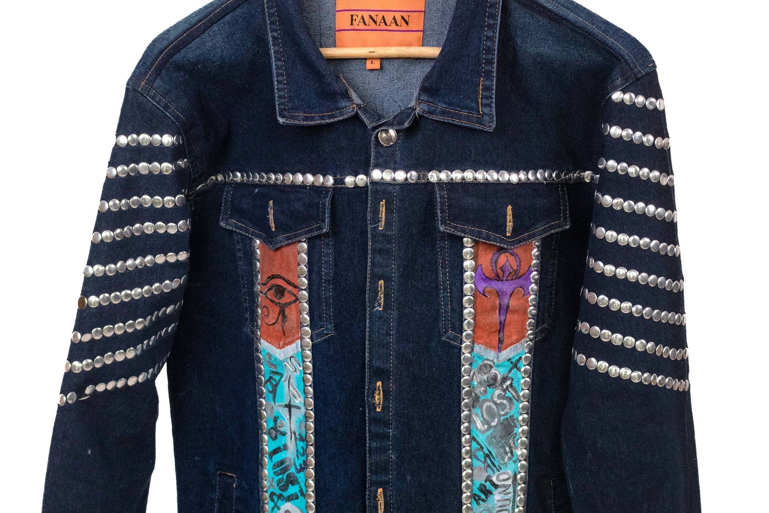 - 100% cotton unisex denim jacket, hand painted, hand embroidered with applique work and metal hardware.