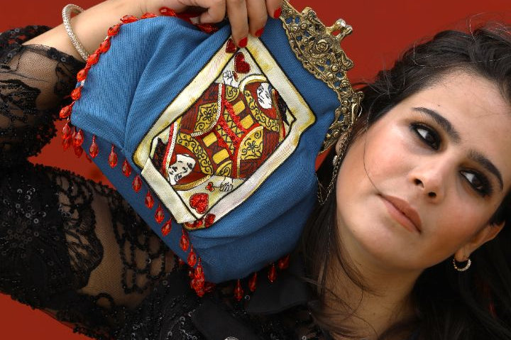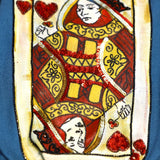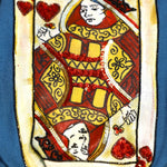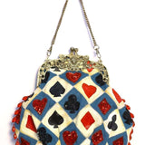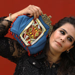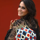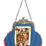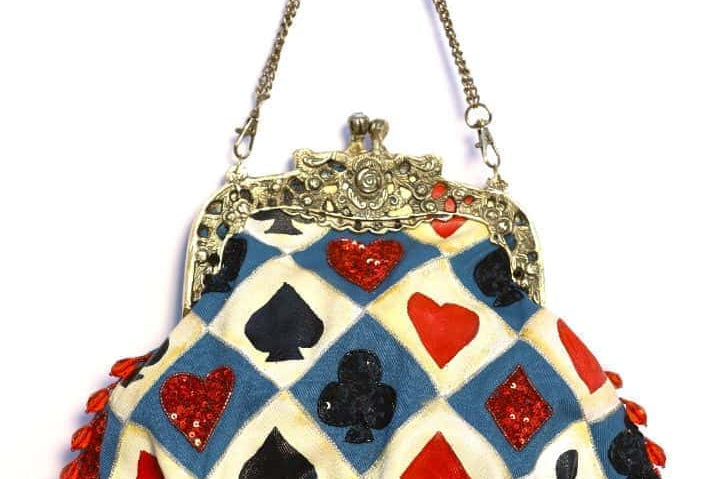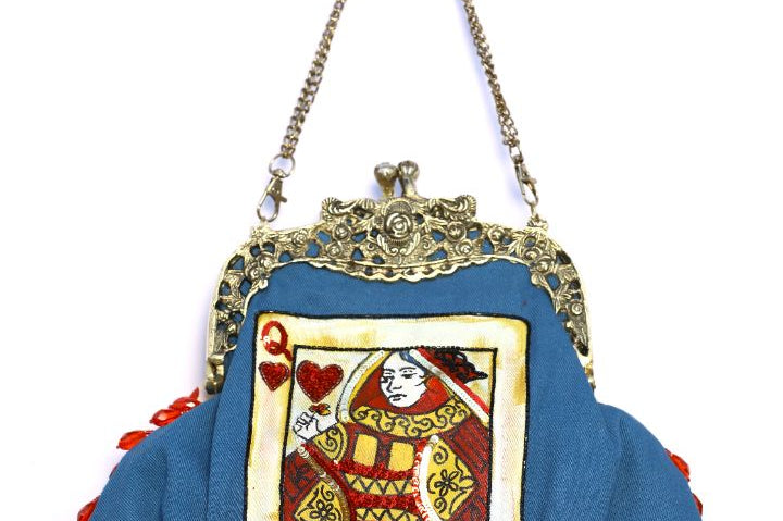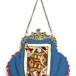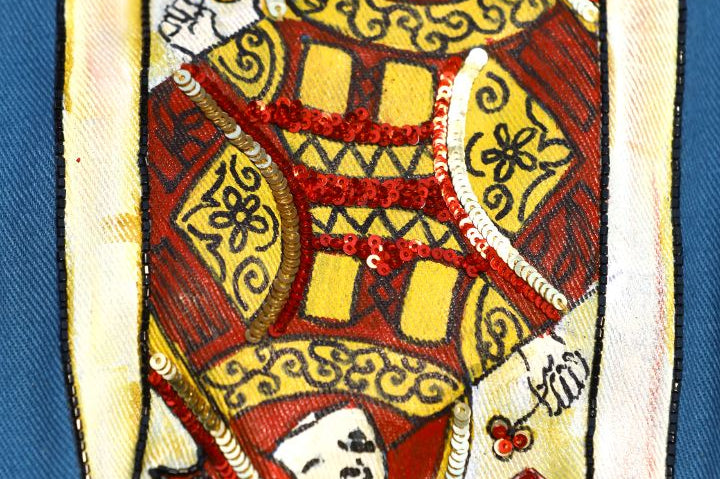 If you identify with the pronouns your/highness, you're obviously going to want to get the Begum batwa. This blue denim batwa clutch bag is fully hand painted with the queen of hearts playing card on one side and the 4 card suits on the other which is then hand embroidered. It features a brass frame with a kiss clasp closure and comes with a detachable chain. This batwa bag is made from dyed cotton denim that has been painted and embellished. To clean, lightly brush with a damp cloth or dry clean. Buff the brass frame with a soft cloth every once in a while to keep it shining. Keep in the dust bag provided to ensure it lasts for years to come. Please note that due to photography and lighting, there may be a slight variation in colour from the image displayed. Images & colours also appear slightly different on various phone and computer screens so please keep that in mind.