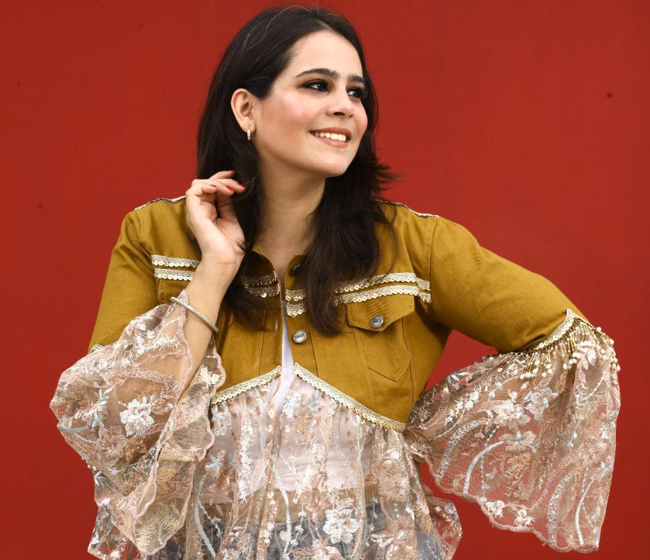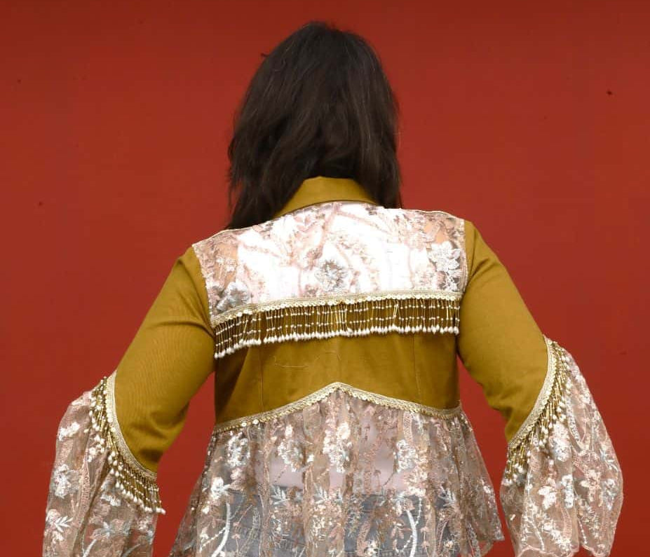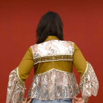 - This cropped jacket with its beautiful mustard accents and delicate embroidered lace peplum and bell sleeves is too ethereal for words. The faux pearl beading just finishes it off perfectly making it a great day jacket.