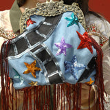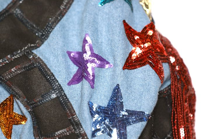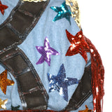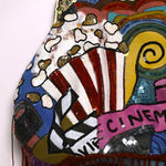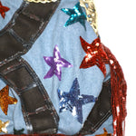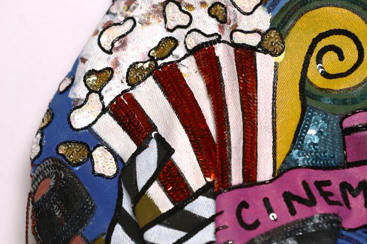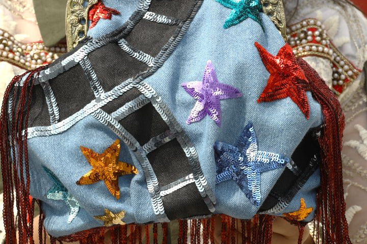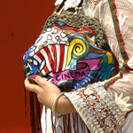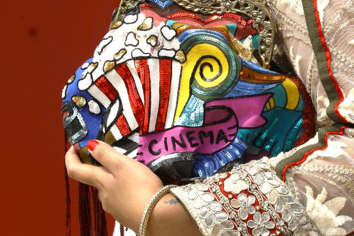 This one is colourful, fun and a true statement piece. Pair with a monochrome outfit to really make it pop and definitely wear it to your next Bollywood night! The denim batwa clutch bag is fully hand painted with film iconography which is then hand embroidered. It features a brass frame with a kiss clasp closure and comes with a detachable chain. This batwa bag is made from cotton denim that has been painted and embellished. To clean, lightly brush with a damp cloth or dry clean. Buff the brass frame with a soft cloth every once in a while to keep it shining. Keep in the dust bag provided to ensure it lasts for years to come. Please note that due to photography and lighting, there may be a slight variation in colour from the image displayed. Images & colours also appear slightly different on various phone and computer screens so please keep that in mind.