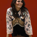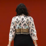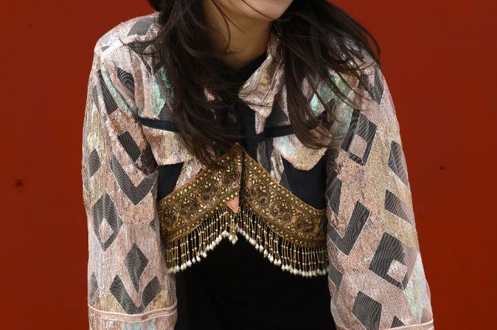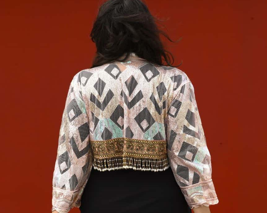 - This micro cropped jacket features embroidered, iridescent sequin sleeves and back, embellished with faux pearl droplets.