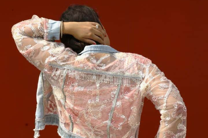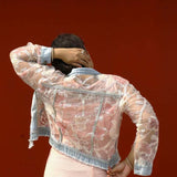 - This cropped jacket is featured embroidered 3d flowers and beading in a delicate blush shade accented with faux pearl droplets.