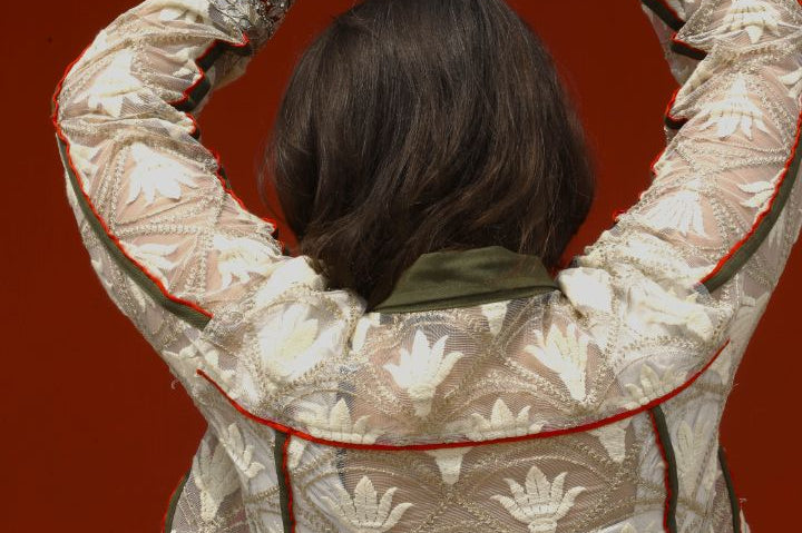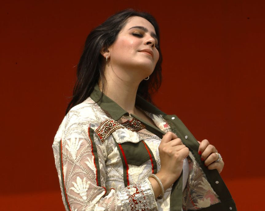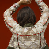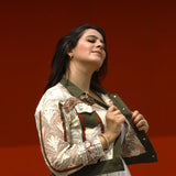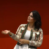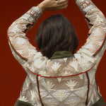 - This cropped jacket is a breath of fresh air with its light cream embroidered panels on the back, front and sleeves and just the right amount of cherry red embellishments and khaki accents.