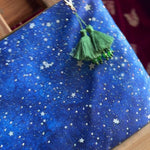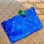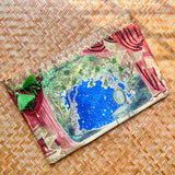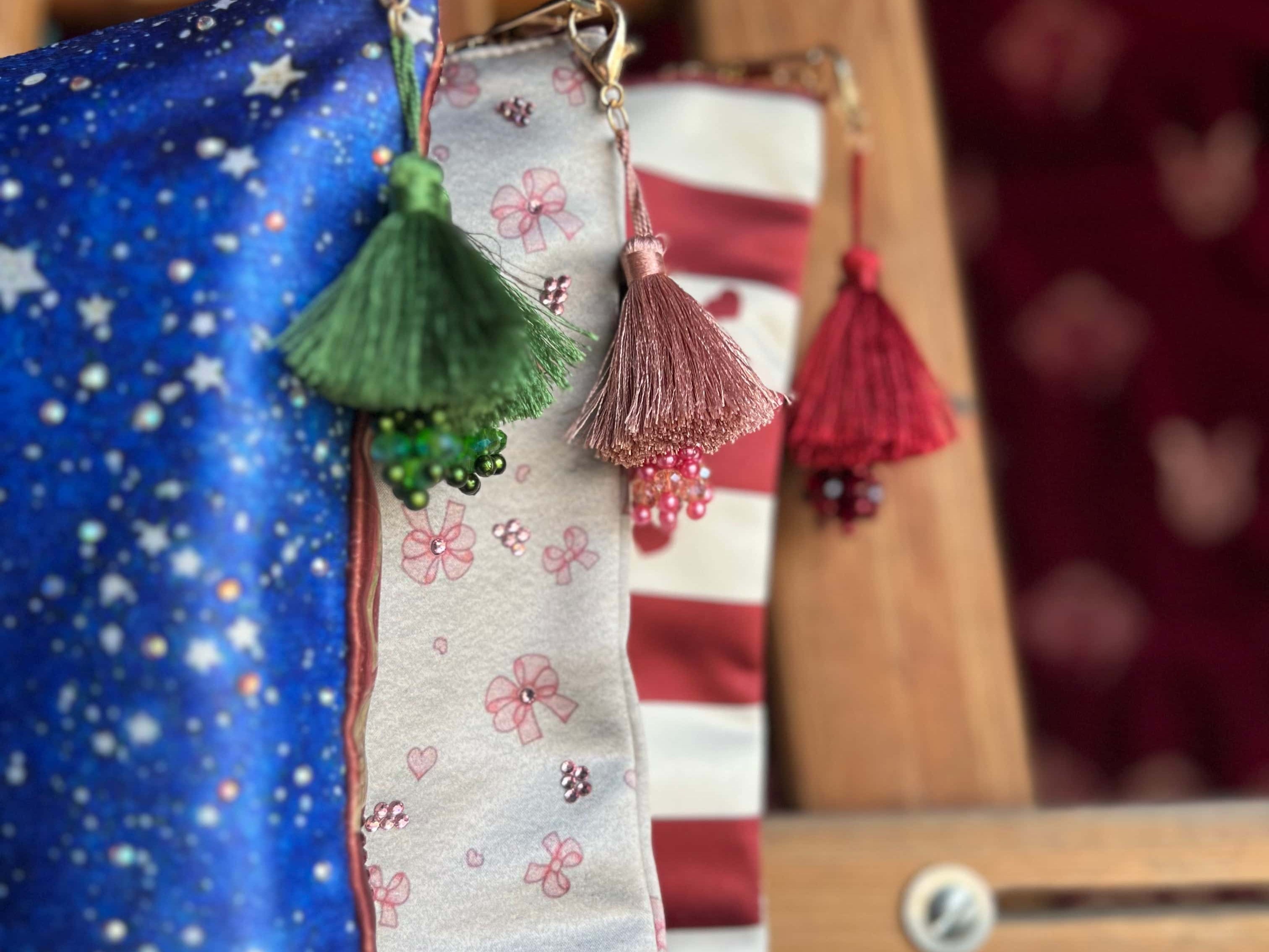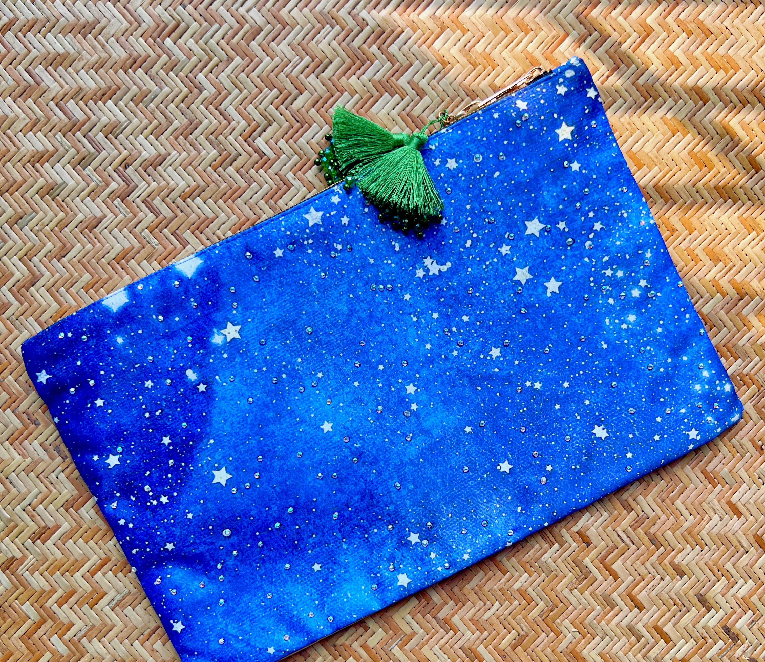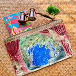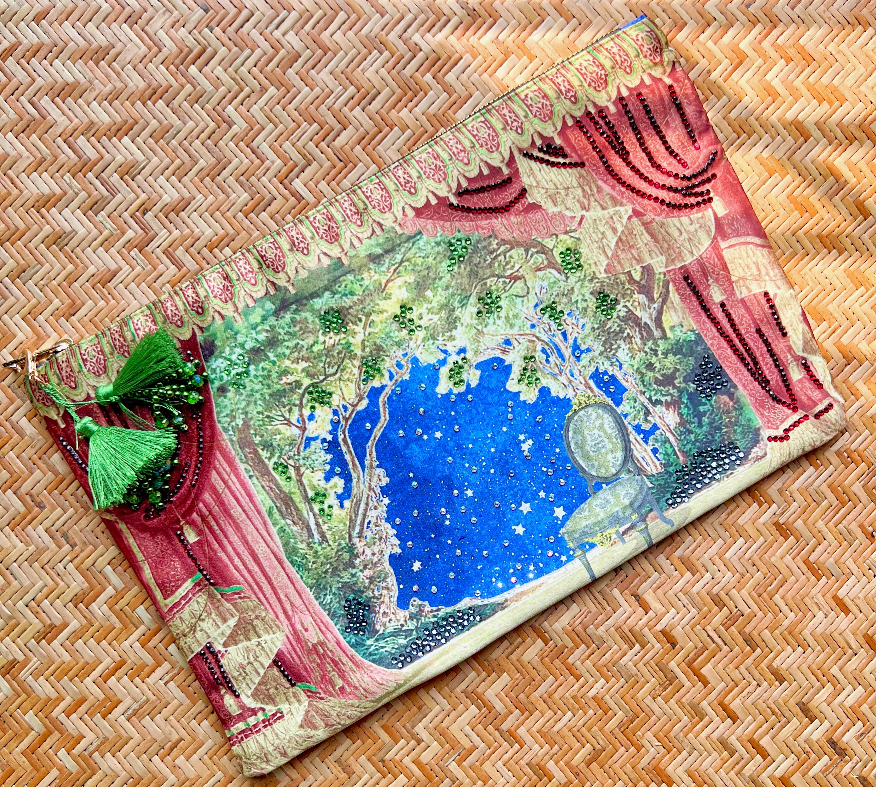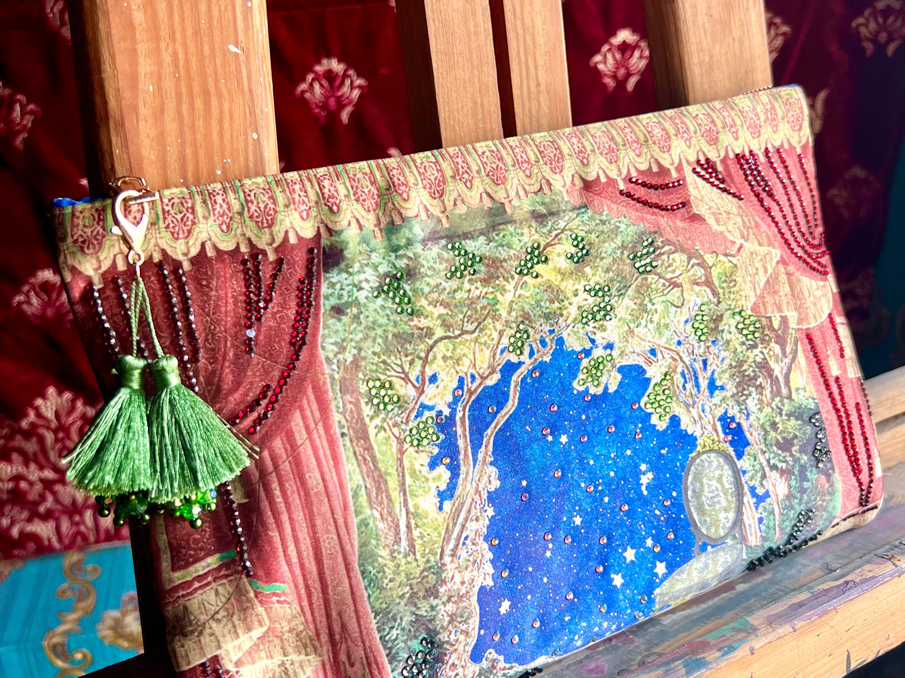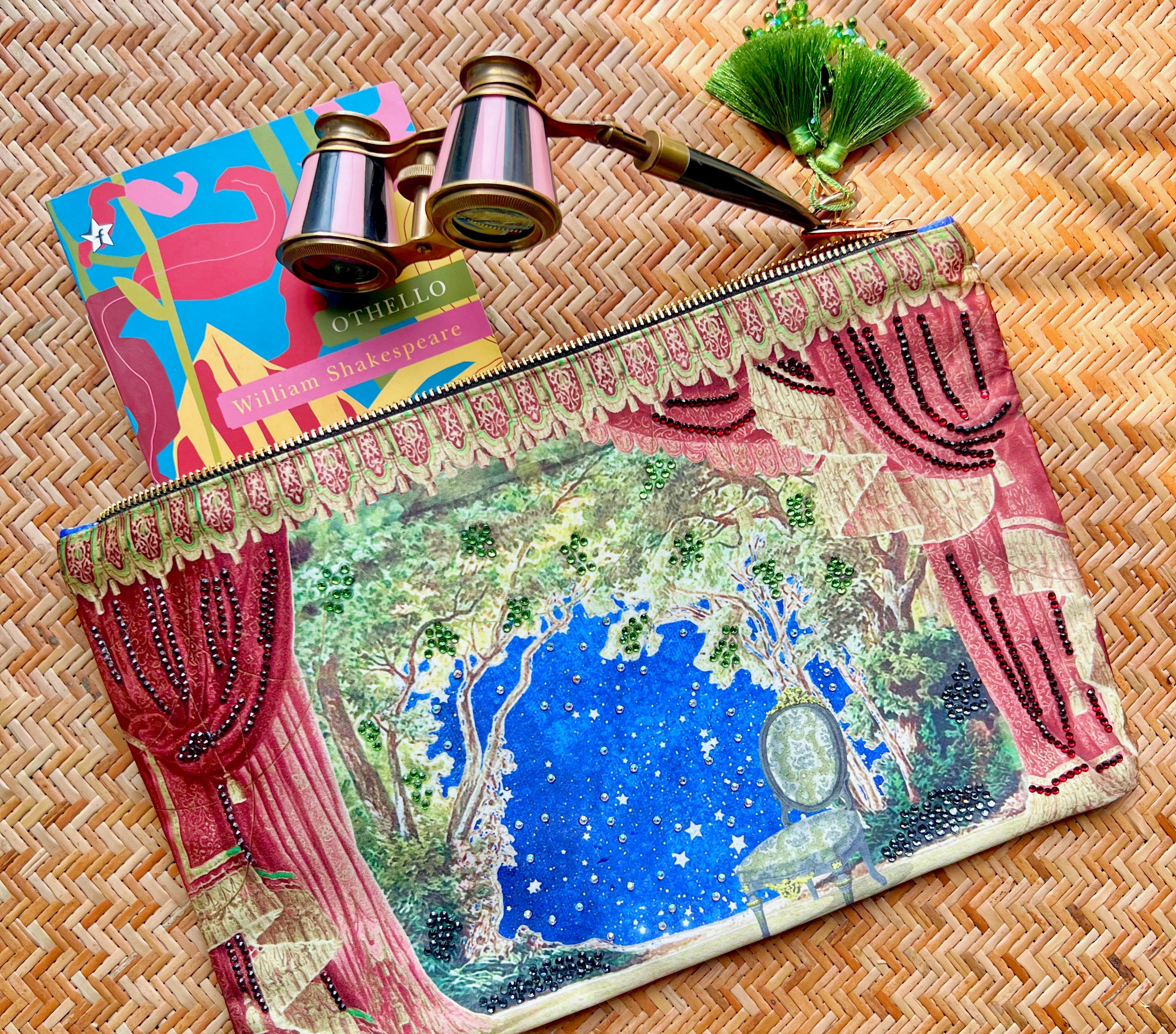 - This dual sided Theatre Play Pochette is designed from the very depths of our brain, digitally printed and then hand embellished with crystals. It features a smooth, no sound zip closure and detachable tassel.